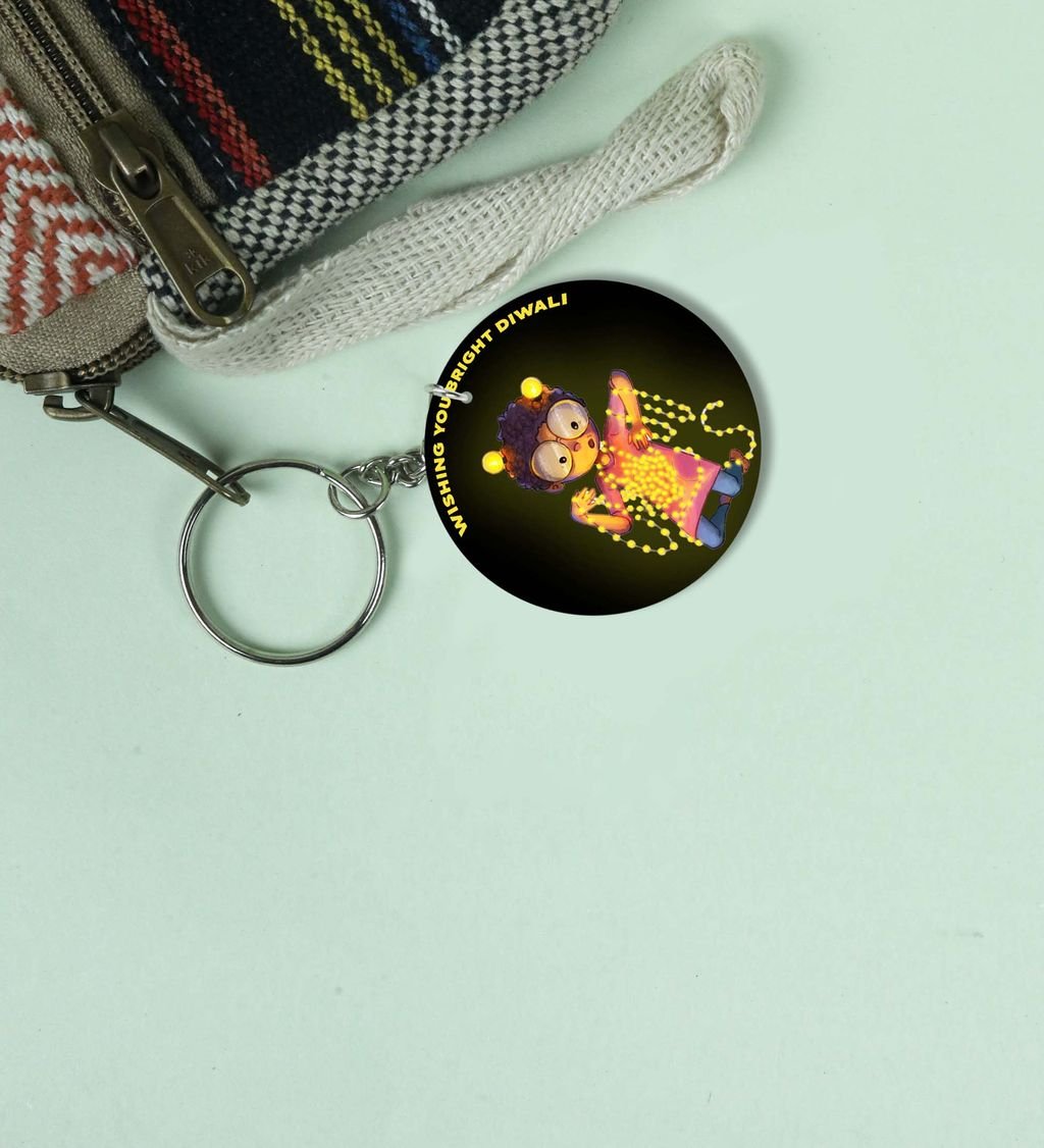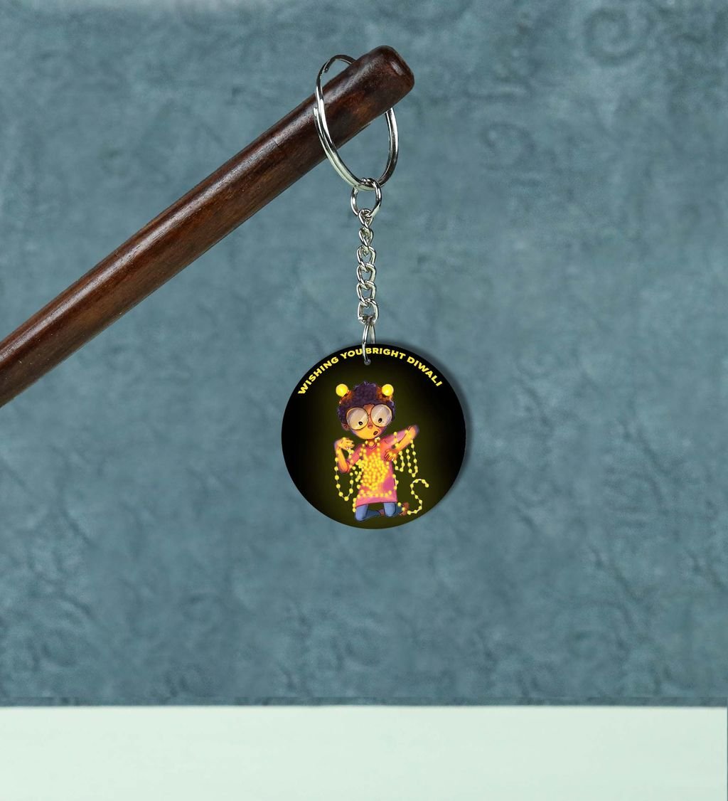 Adorable Character Glowing with Diwali Lights Design Printed Round Keychain Pack of 2