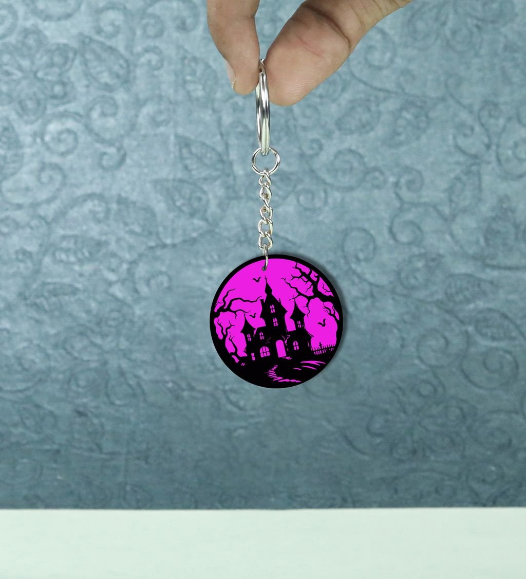 Creepy Castle Silhouette with Moonlit Trees Printed Round Keychain Pack of 2