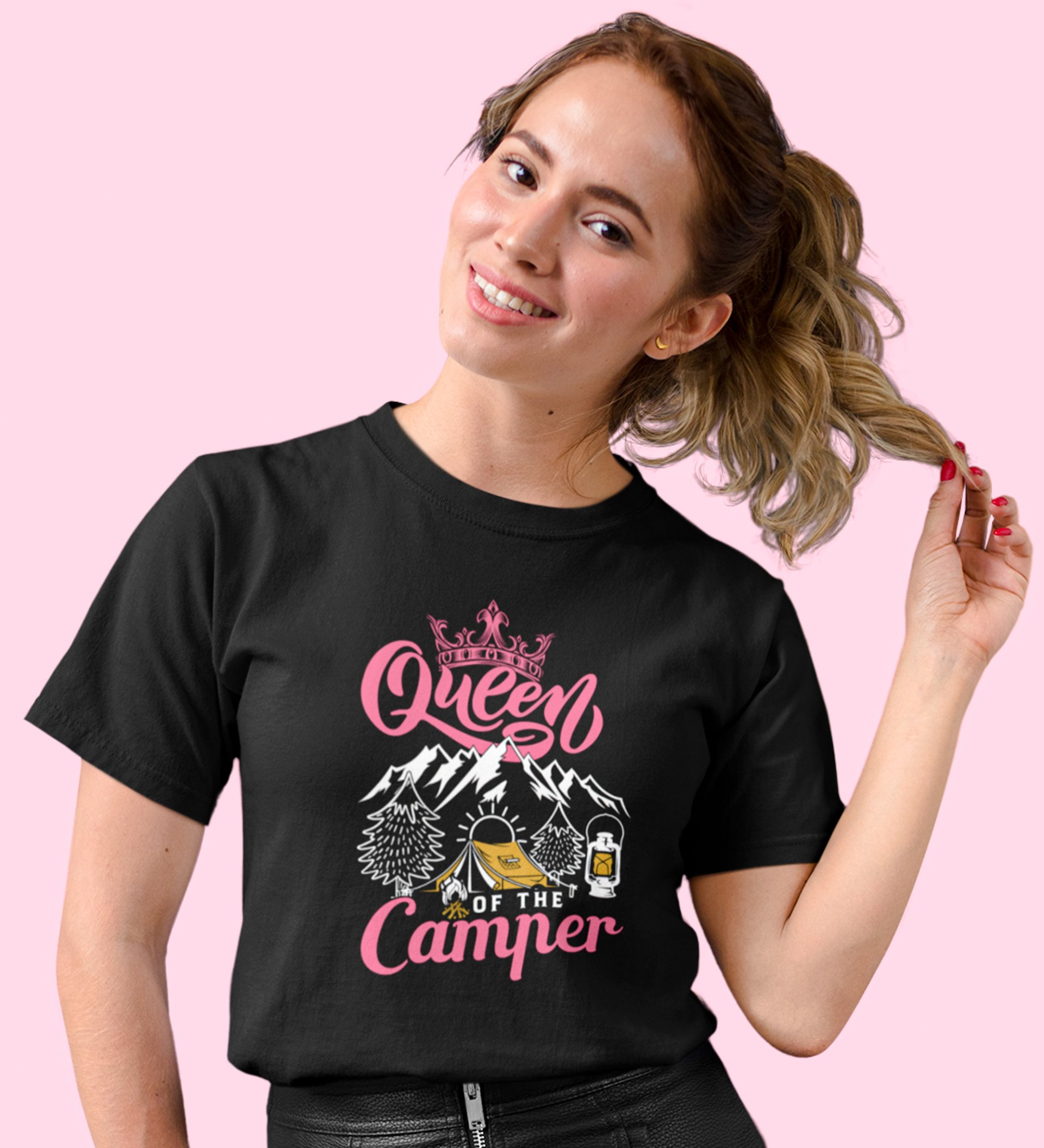 HopOfferQueen Of Camper Black Round Neck Cotton Half Sleeved Women's T-Shirt with Printed Graphics
