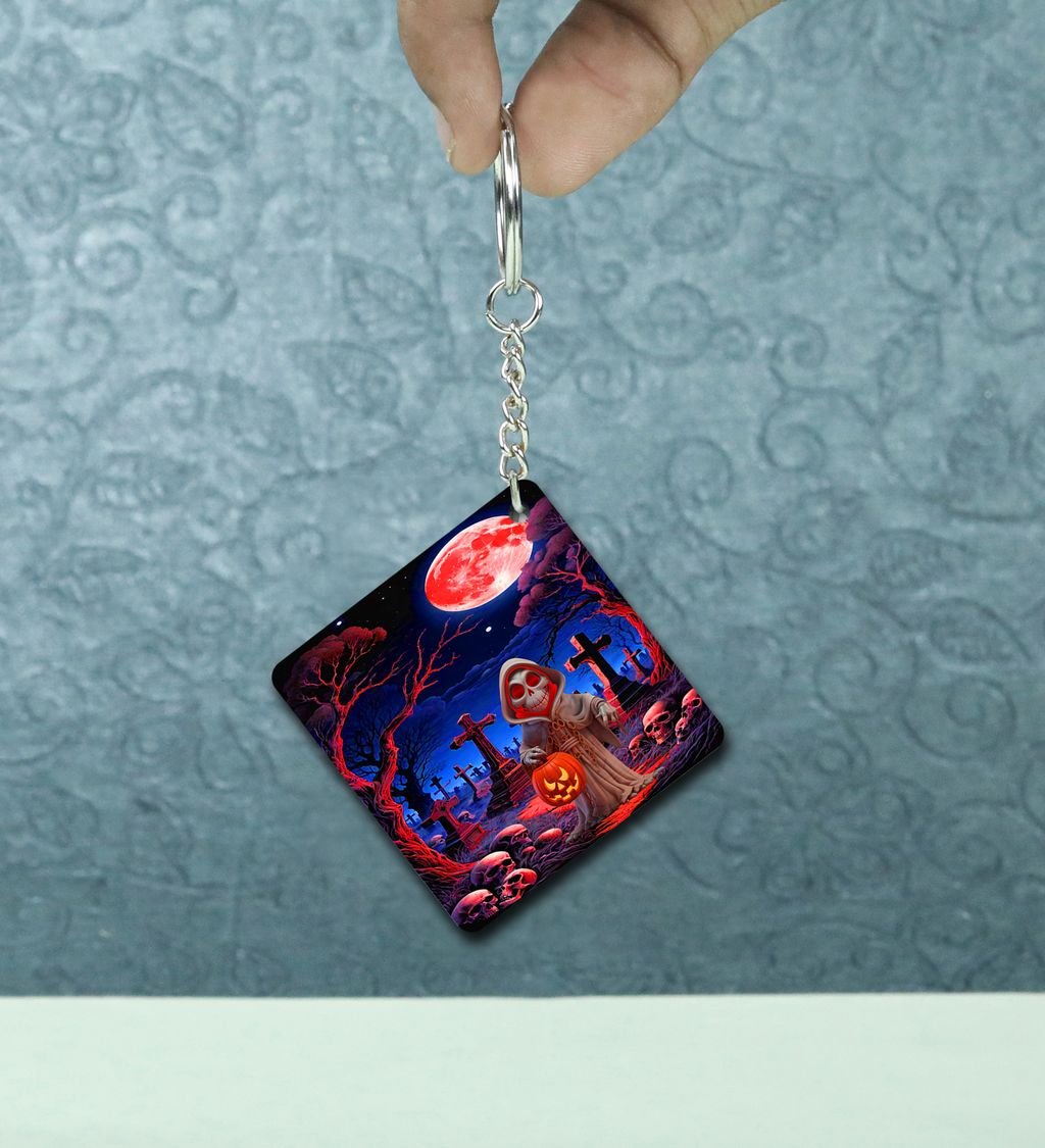 Red Moon Graveyard Scene with Ghostly Pumpkin Carrier Printed Keychain Pack of 2