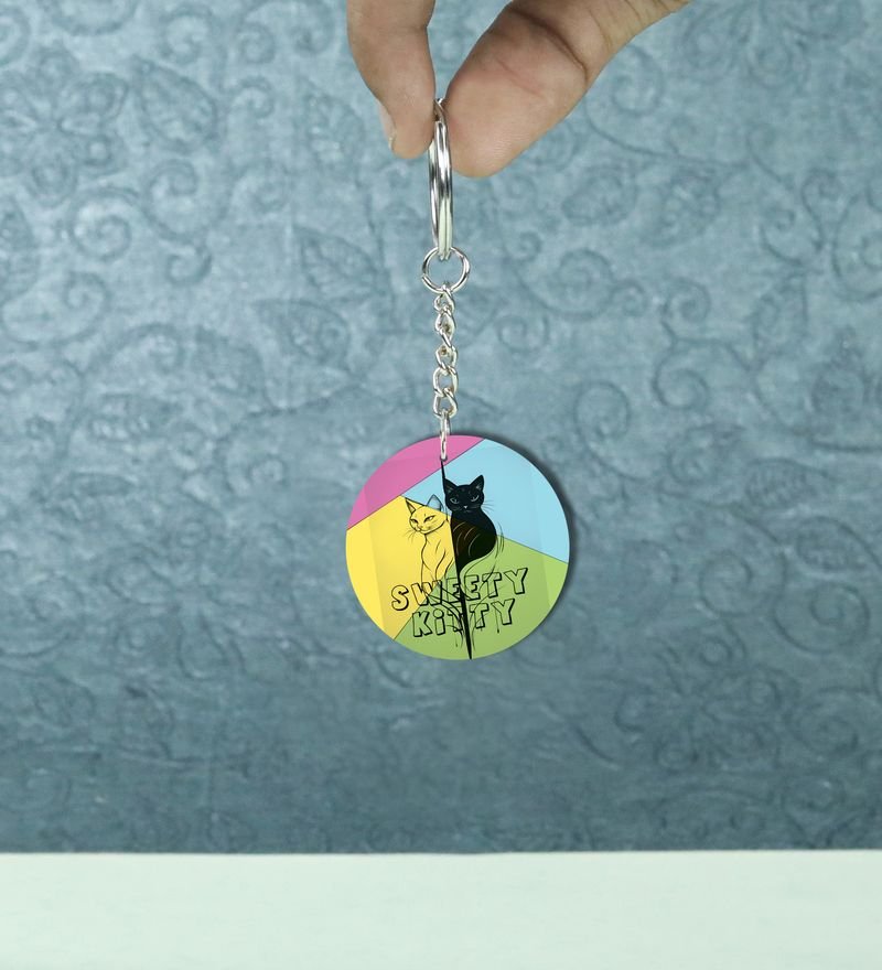 Sweety Kitty Color Block Design Printed Round Keychain Pack of 2